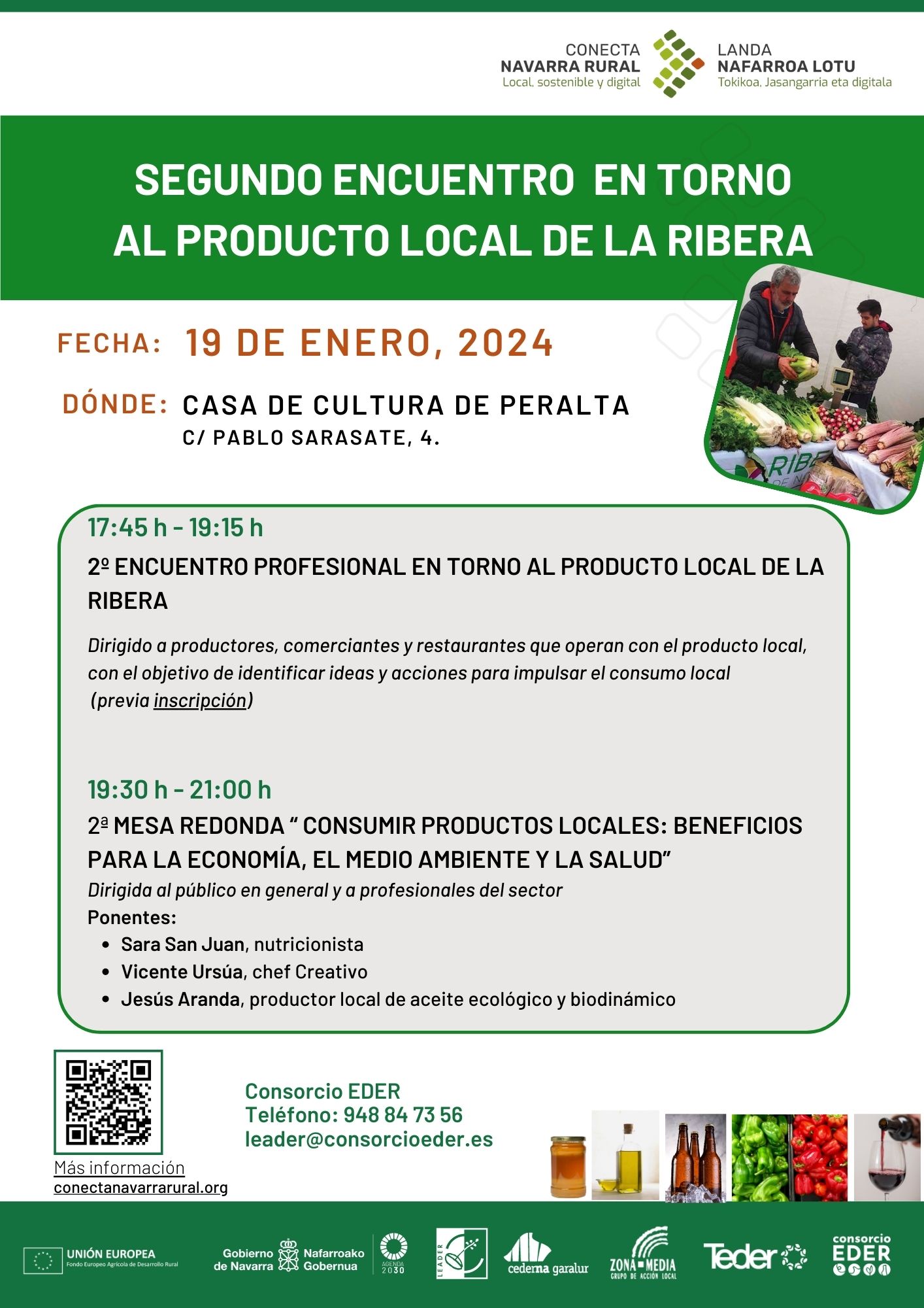 - Si eres un consumidor: participa en la 2ª Mesa Redonda “Consumir productos locales: beneficios para la economía, el medio ambiente y la salud”. Contaremos con 3 ponentes expertos: Sara San Juan, Nutricionista; Vicente Ursúa, Chef creativo; y Jesús Aranda, Productor local de aceite ecológico y biodinámico. Juntos, ofrecerán un punto de vista multidimensional sobre cómo tu elección de productos locales no solo impulsa la economía y preserva el medio ambiente, sino que también favorece tu salud. Conectémonos y destaquemos la importancia de integrar productos locales en todos los aspectos de la vida diaria. ¡Tu elección cuenta! 🌱🛒🍏